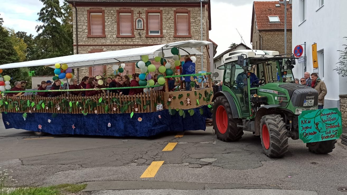 Die viele Mühe und Kreativität beim Dekorieren des Wagens zahlten sich aus: Am Montagabend gewann das KKM-Jugendorchester bei der Wagenprämierung des Fördervereins Erntedankfest und Brauchtum e.V. den dritten Platz in der Kategorie „Festwagen“.
